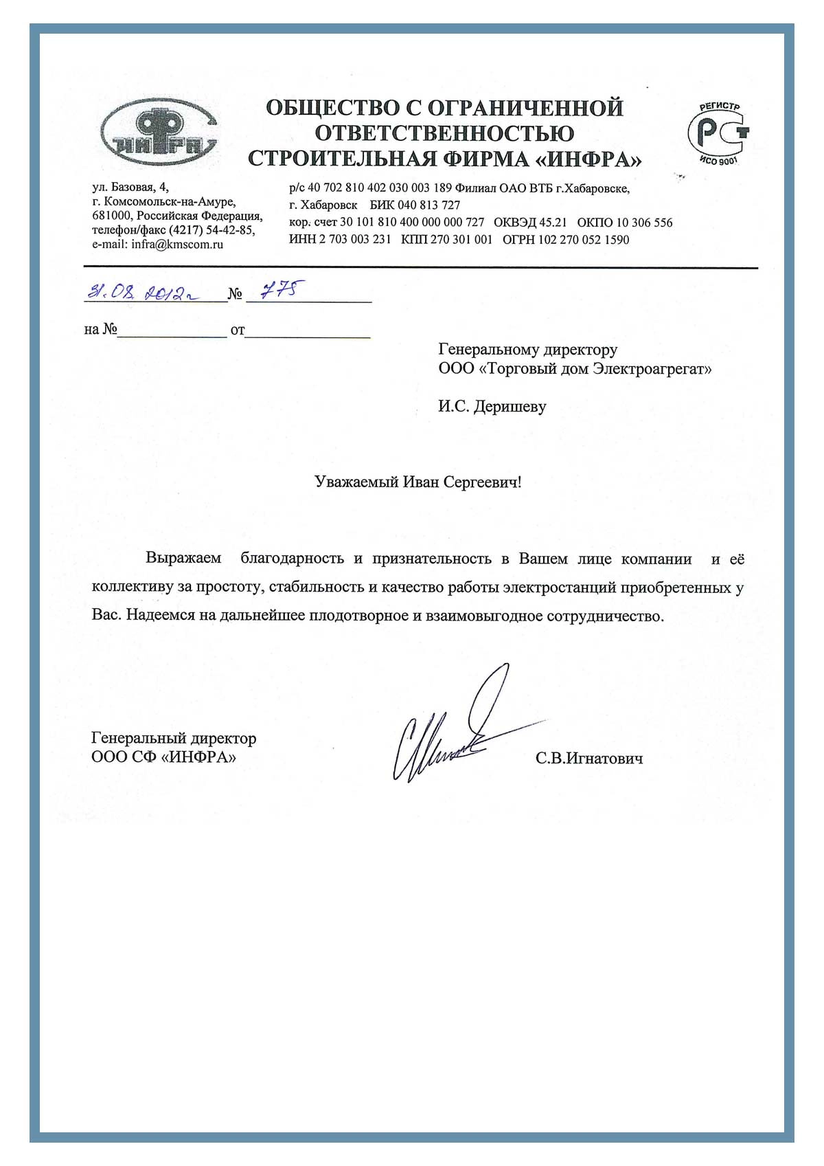 Отзыв контрагентов о компании ООО «ТД Электроагрегат» и  исполненном проекте для ООО СФ "ИНФРА", г. Комсомольск-на-Амуре