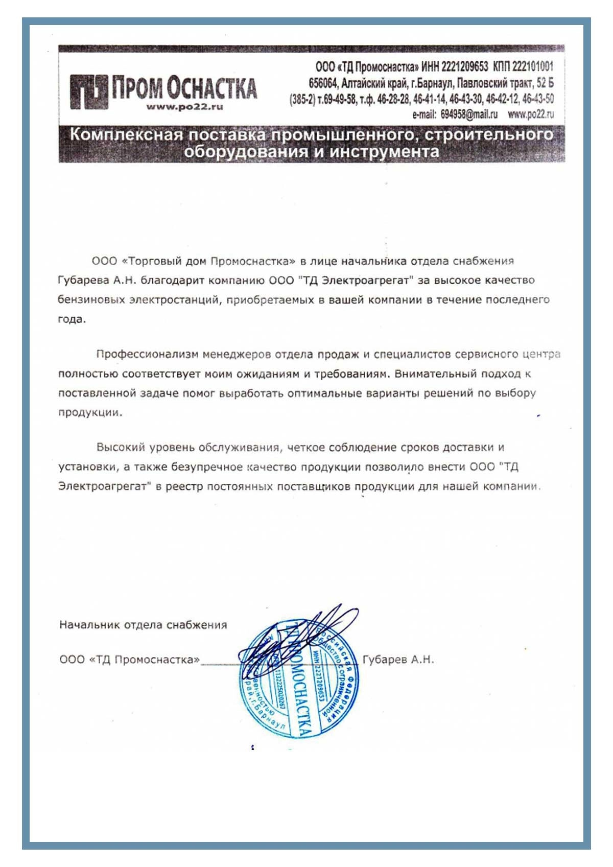 Отзыв контрагентов о компании ООО «ТД Электроагрегат» и  исполненном проекте для ООО "Торговый дом Промоснастка", г. Барнаул