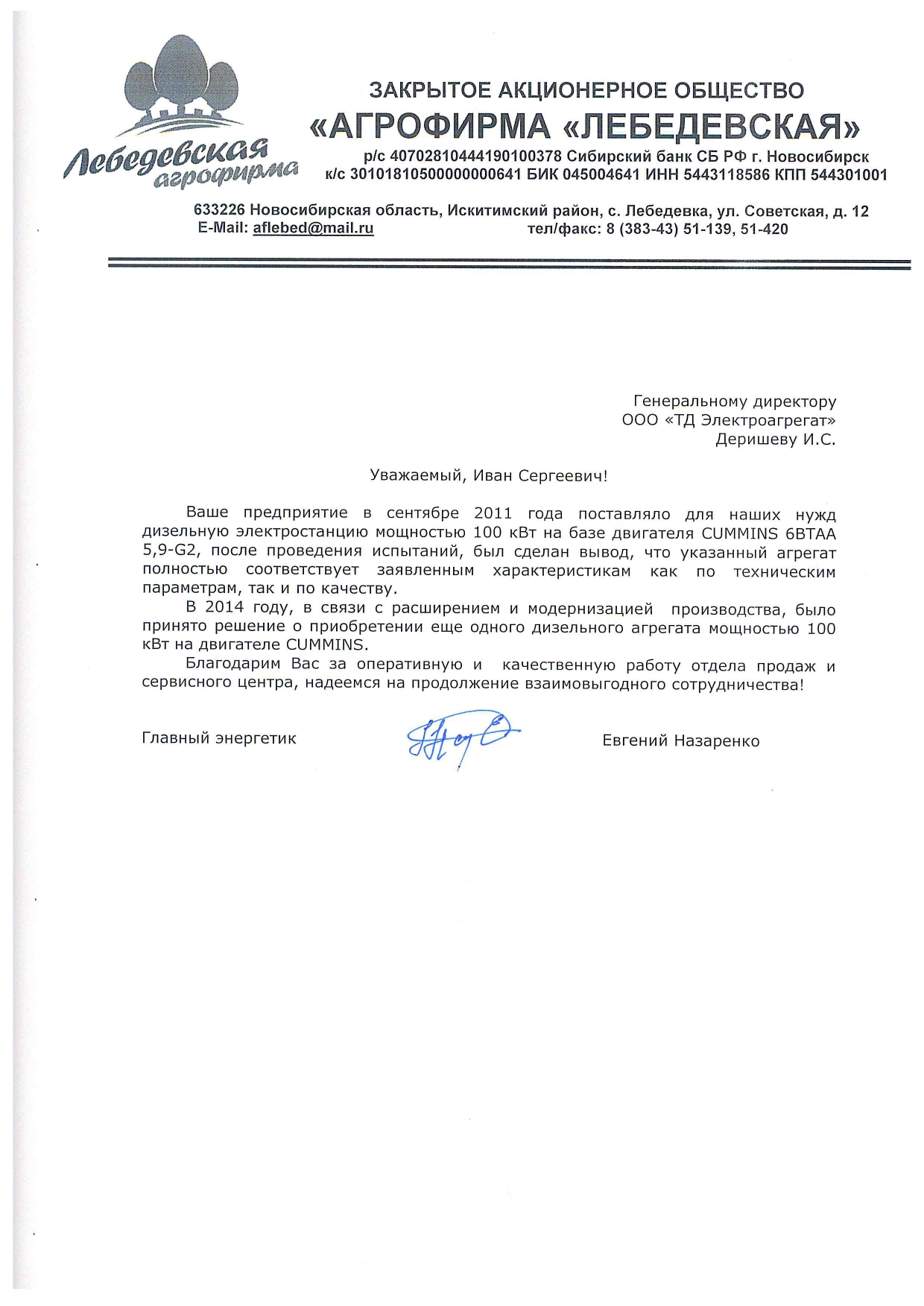 Отзыв контрагентов о компании ООО «ТД Электроагрегат» и  исполненном проекте для ЗАО "Агрофирма "Лебедевская", Новосибирская обл.